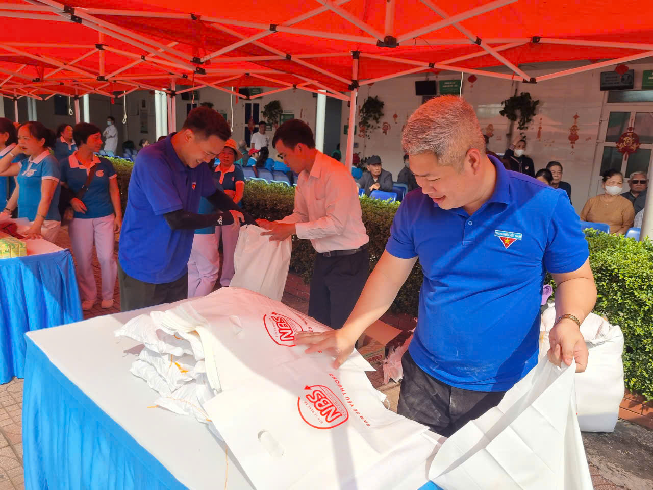 Những phần quà mang hình ảnh logo công ty và lời nhắn gửi "San sẻ yêu thương" được các Đoàn viên chuẩn bị trao tới cho các bệnh nhân có hoàn cảnh khó khăn.